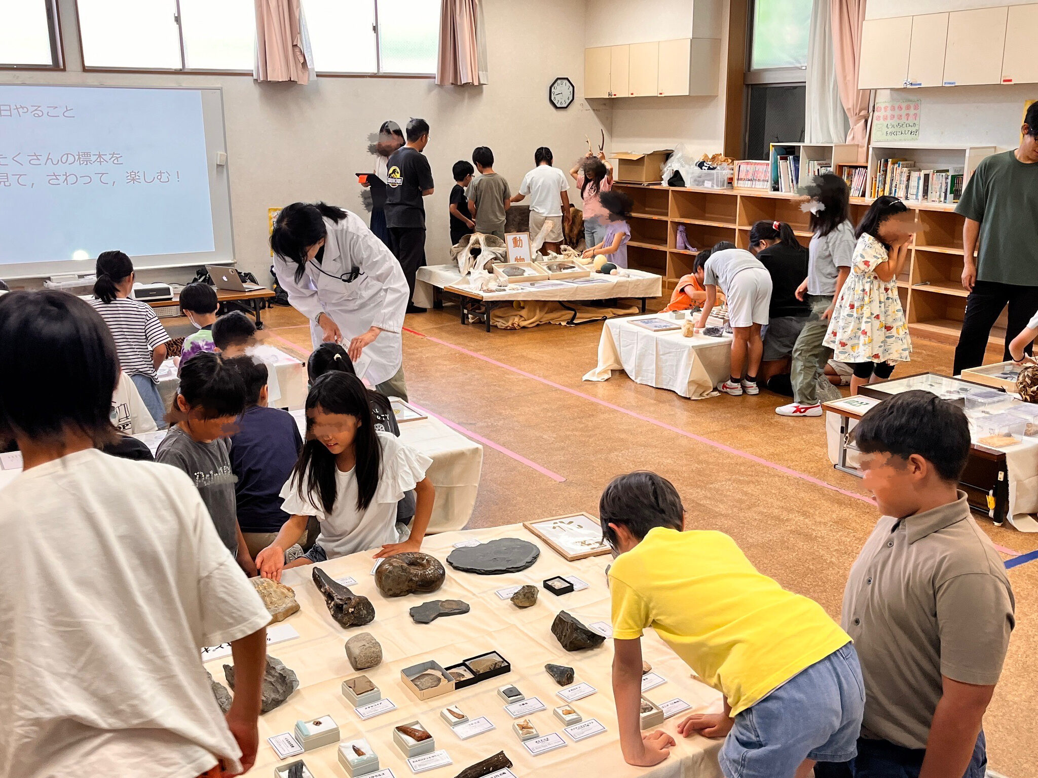日々収集・保管している標本をたくさん車に詰め込み伺います。映像や情報がネットで簡単に手に入るいま、実物からしか分からない迫力や重さ、質感まで感じとってもらいたい。毎年実施している保育施設や小学校もあります。